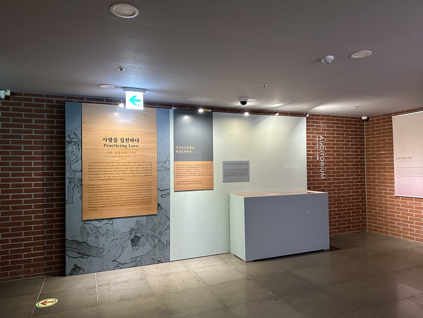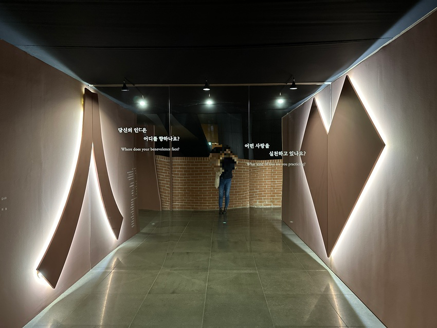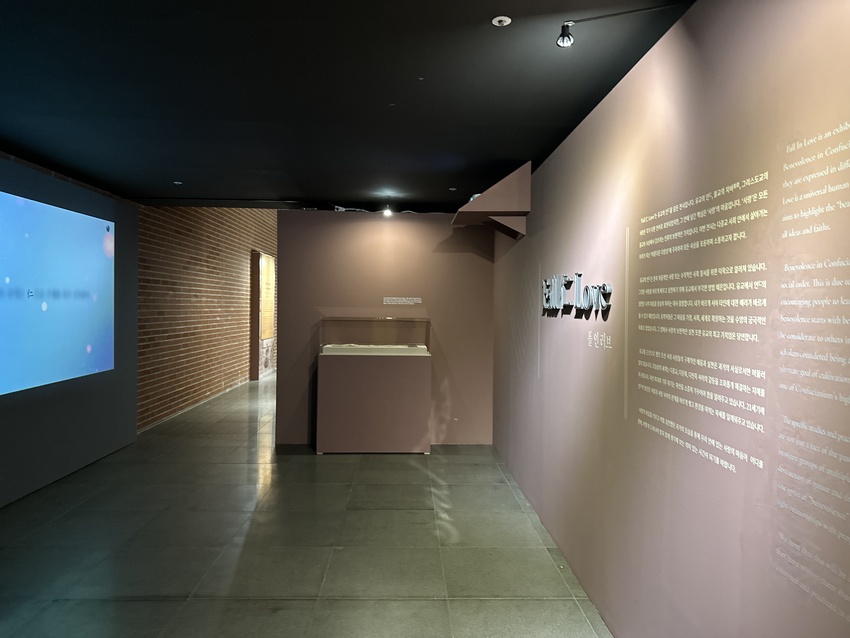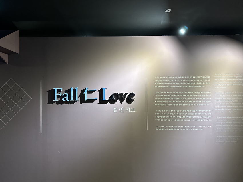 건물 입구에 바로 안내해주시는 분들이 계셔서 예약 확인을 하고 전시관에 입장하였습니다. 전시관 입구에 쓰인 문구를 읽어보았습니다. 유교의 인, 불교의 자비, 그리스도교의 사랑은 각기 다른 언어로 표현되었지만, 그 안에 담긴 핵심은 '사랑'의 마음이고, '사랑'은 모든 종교와 사상에서 강조하는 인류의 보편적인 가치입니다. 폴 인 러브(Fall 仁 Love) 는 사랑의 마음을 키우고 이를 실천했던 과거의 모습을 통해 우리 안에 있는 사람의 마음이 어디를 향해, 어떻게 드러나야 할지 생각해 볼 수 있는 전시였습니다.