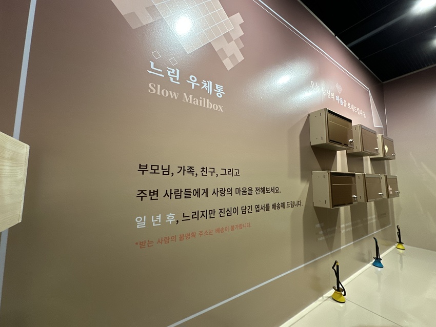 전시 중간에 느린 우체통이 있었습니다. 엽서에 부모님, 가족, 친구, 주변인들에게 편지를 쓰면 일 년 후 배송해주는 이벤트인데요. 저는 일년 후의 나에게 오늘의 마음을 적어 보냈습니다. 지금의 감정이 잘 도착하겠죠?