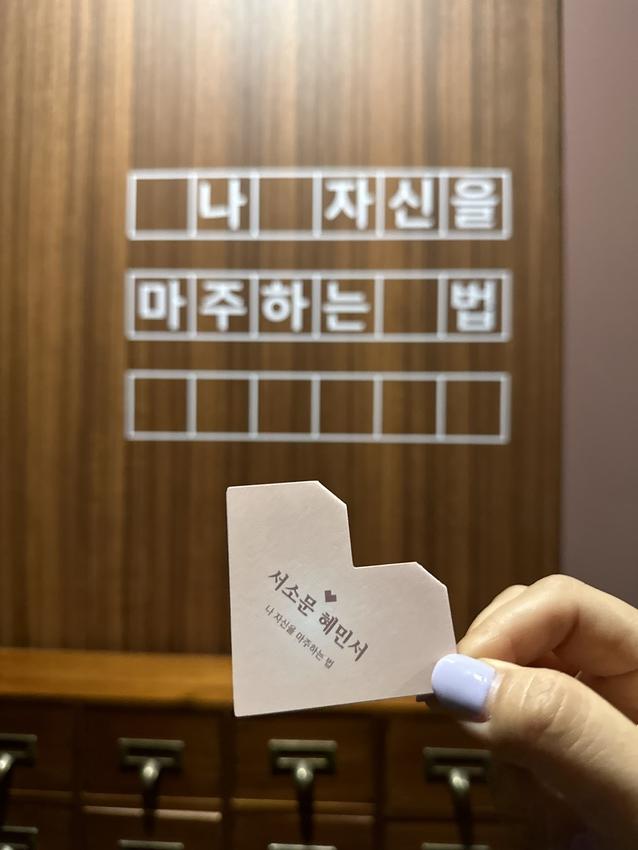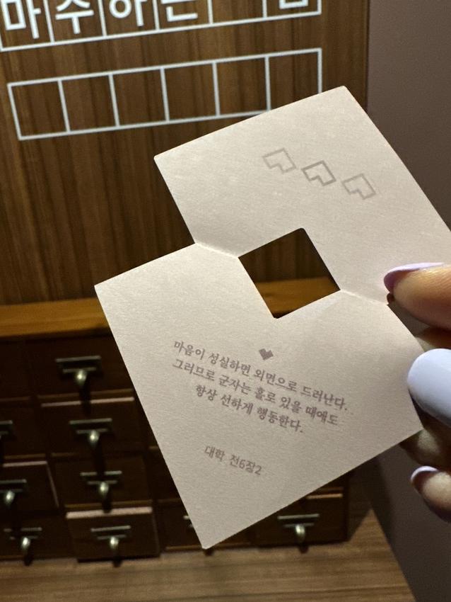 전시관 관람이 끝나면 서소문 혜민서의 처방을 받을 수 있습니다. 유교 경전 논어, 맹자, 중용, 대학 속 문구를 통해 현재 삶 속에서 반복되는 고민과 문제를 생각해 보고 선조들의 지혜로 작은 위로를 받는 것인데요. 전시장에 비치된 여러 개의 상자 중 하나를 골라 처방전을 뽑으시면 됩니다. 하트모양 처방지에 위로가 되는 문구가 적혀있습니다.
